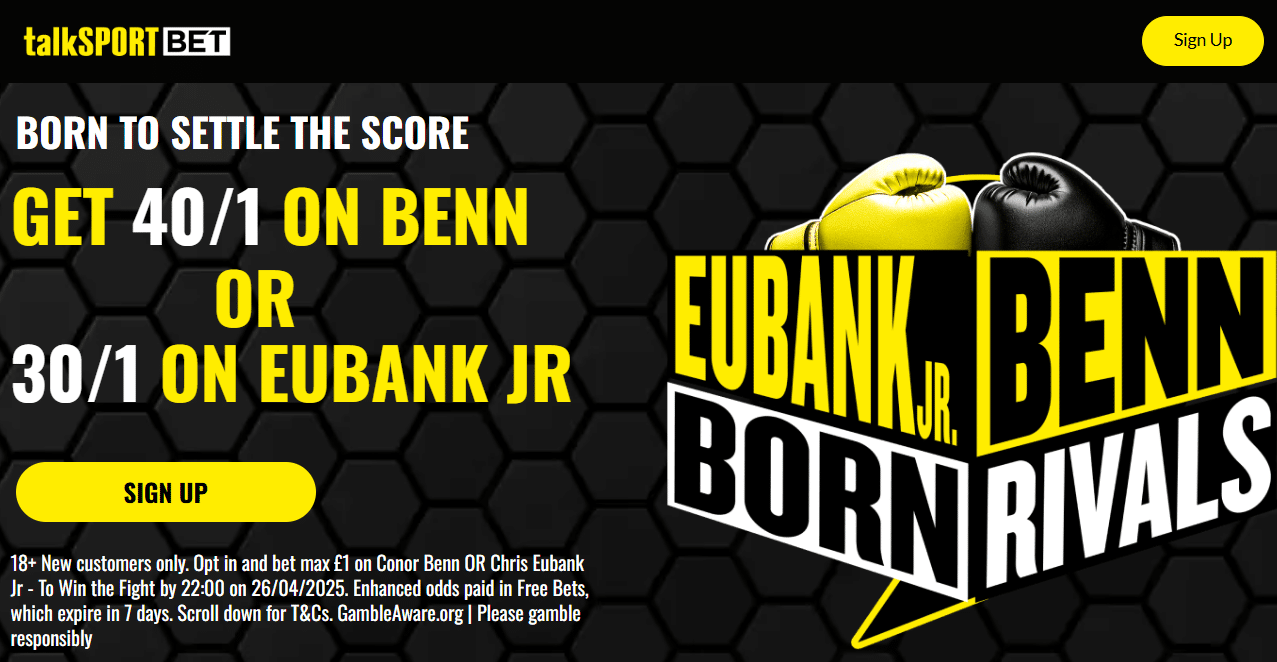18+. New UK customers (Excluding NI) only. Min Deposit £10. Min stake £10. Min odds Evs. Free bet applied on 1st settlement of any qualifying bet. 30 days to qualify. Free bets expire in 7 days. Cashed out/Free Bets won’t apply. Account & Payment method restrictions apply. 1 Free Bet offer per customer, household & IP Address only. 18+. T&Cs apply.