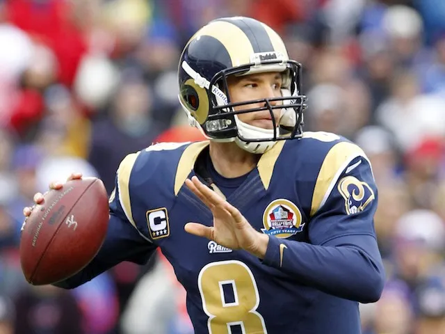 Sam Bradford threw a last-minute touchdown to seal a late 15-12 win for the St Louis Rams.