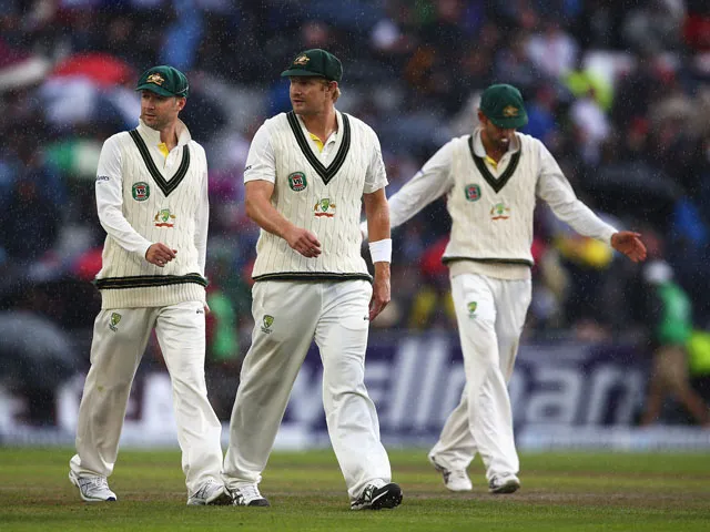 ENG 37-3RAIN STOPS PLAY: Clarke and Watson both have a few words with Bell and the Australians are annoyed more when rain starts to fall again at Old Trafford. It's pretty heavy, so the covers are rushed on to the field.