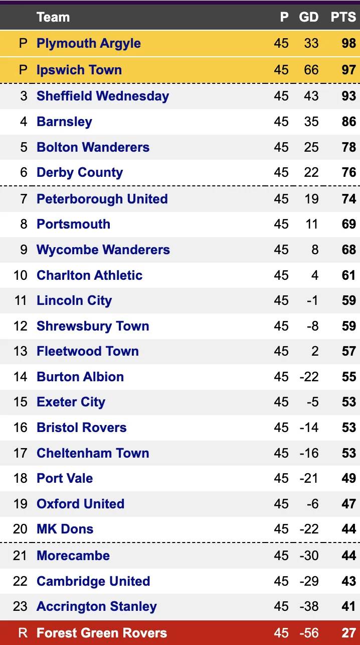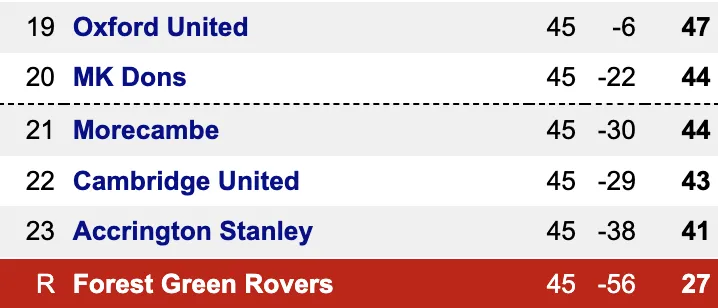 It is also worth noting that Oxford United are not quite mathematically safe, but they would need to lose, and for MK Dons and Morecambe to both win, with a 24-goal swing, to be in any danger.