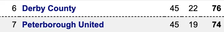 Should Derby share the spoils and Peterborough win by three or more goals then Peterborough will claim the final playoff spot, while a Derby defeat coupled with a Peterborough win at Barnsley would also see Posh join Wednesday, Barnsley and Bolton in the playoffs.