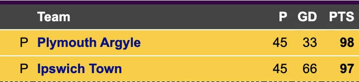 However, should they drop points then the door would be open for Ipswich; the Tractor Boys are just one point adrift of Argyle, and so if they win at mid-table Fleetwood and Plymouth drop points at Port Vale then Ipswich will be crowned champions of the third tier for the first time since 1956-57.