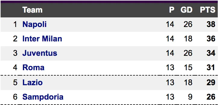 Napoli - twice runners-up during the Old Lady's reign - currently lead the way having dropped only four points from their opening 14 games of the season, while Inter Milan are hot on their heels with Juve in third.