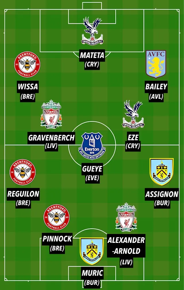 Sports Mole's Premier League Team of the Week (4-3-3): Muric; Assignon, Alexander-Arnold, Pinnock, Reguilon; Eze, Gueye, Gravenberch; Bailey, Mateta, Wissa
