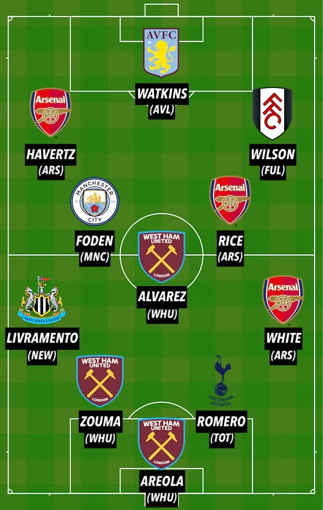 Sports Mole's Premier League Team of the Week (4-3-3): Areola; White, Romero, Zouma, Livramento; Rice, Alvarez, Foden; Wilson, Watkins, Havertz