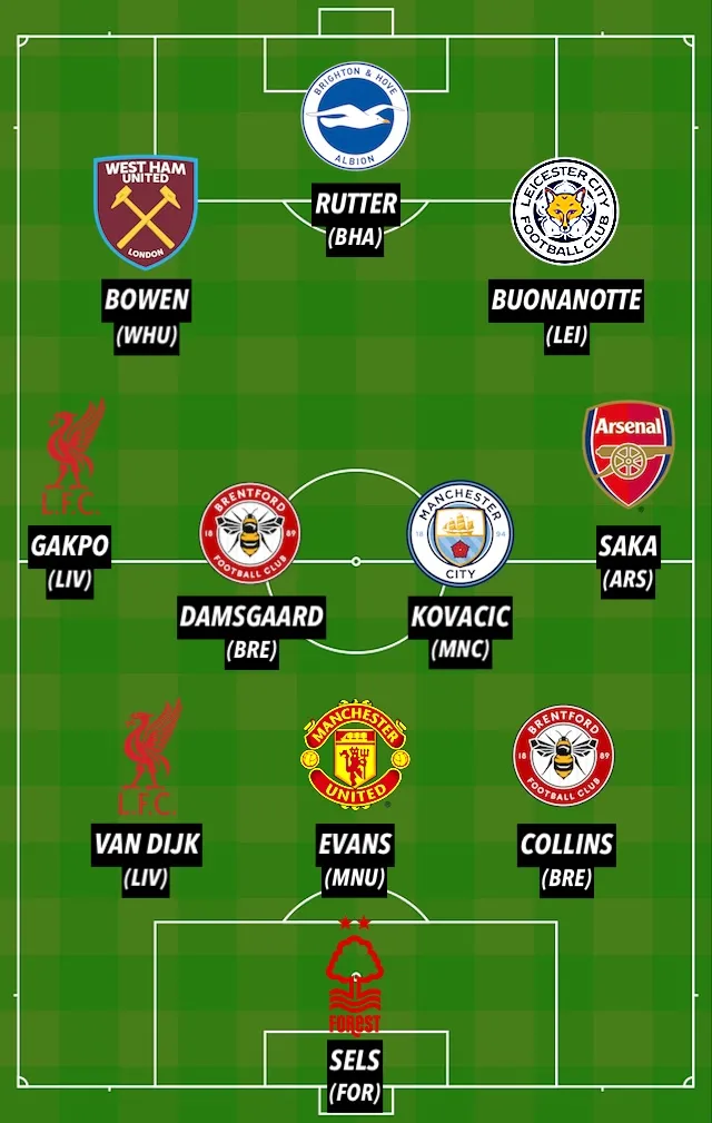 Sports Mole's Premier League Team of the Week (3-4-3): Sels; Collins, Evans, Van Dijk; Saka, Kovacic, Damsgaard, Gakpo; Buonanotte, Rutter, Bowen