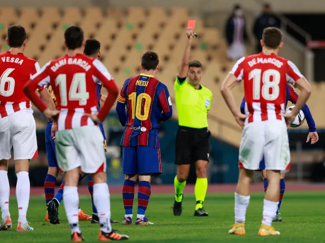 Lionel Messi saw red for the first time ever in his Barcelona career for lashing out at Athletic goalscorer Villalibre in Sunday's final. The length of the Argentine's suspension is yet to be determined by the Spanish FA's disciplinary committee, but he will not be available on Thursday.