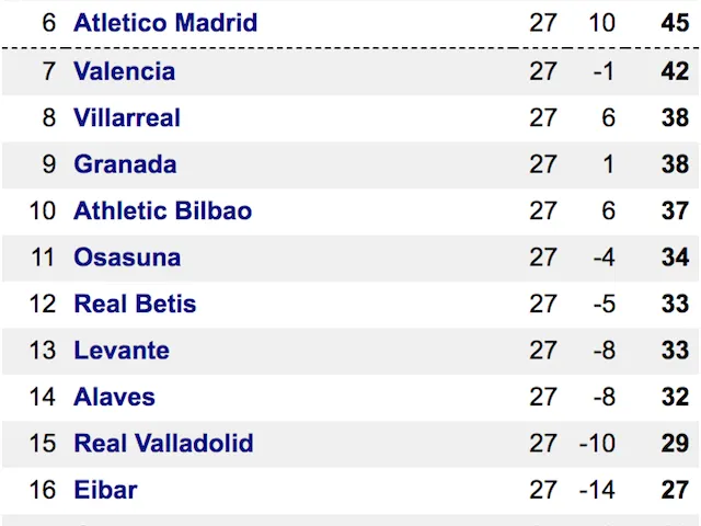 Los Rojiblancos have their lowest points tally at this stage of a campaign since Diego Simeone took over but know that a Champions League spot is still very much in their grasp despite scoring just 31 goals so far - in the top 12 only Athletic Bilbao have managed fewer.