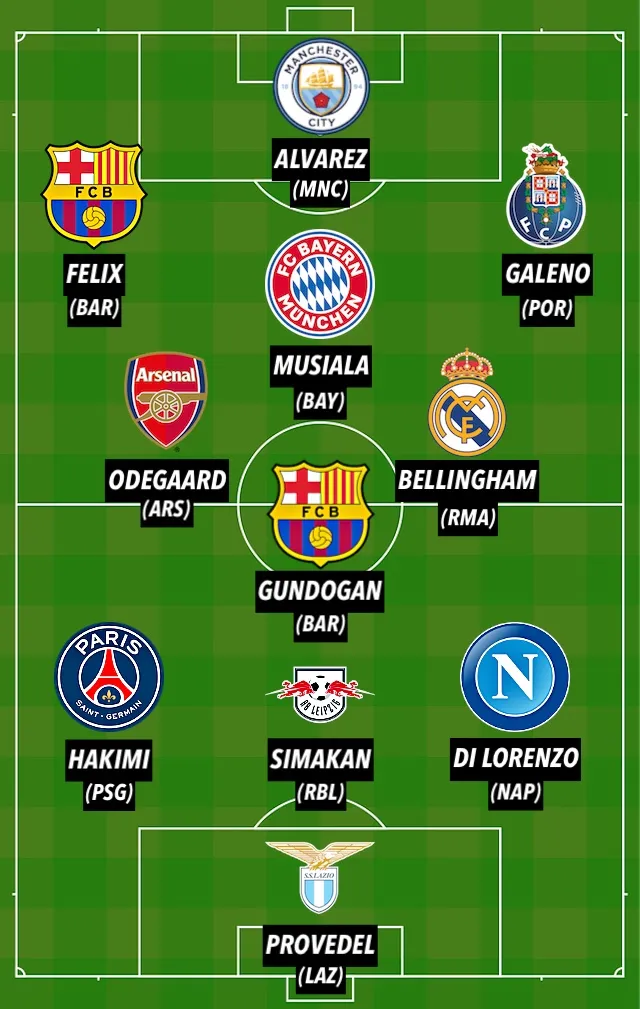 Sports Mole's Champions League team of the week (3-4-3): Provedel; Di Lorenzo, Simakan, Hakimi; Gundogan, Bellingham, Odegaard, Musiala; Galeno, J Alvarez, Felix