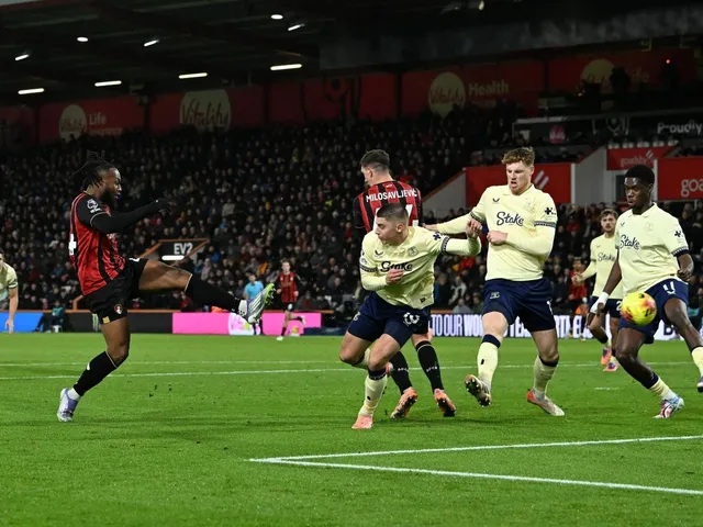 Bournemouth swing in a free kick from the left and after chaos in the box, the ball lands at the feet of Antoine Semenyo in front of the six-yard box, and Jordan Pickford saves his instinctive strike.