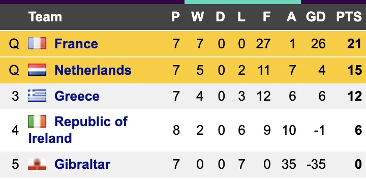 Gibraltar vs. Netherlands (7.45pm) Greece vs. France (7.45pm)
