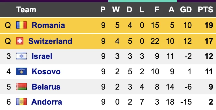 Andorra vs. Israel (7.45pm) Kosovo vs. Belarus (7.45pm) Romania vs. Switzerland (7.45pm)