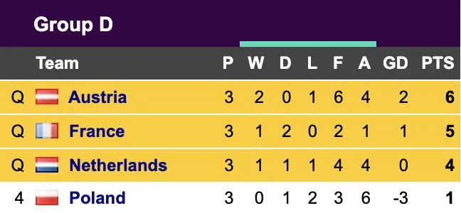 June 16: Poland 1-2 Netherlands (Volksparkstadion) - 15:00 (14:00 BST) June 17: Austria 0-1 France (Merkur Spiel-Arena) - 21:00 (20:00 BST) June 21: Poland 1-3 Austria (Olympiastadion) - 18:00 (17:00 BST) June 21: Netherlands 0-0 France (Red Bull Arena) - 21:00 (20:00 BST) June 25: Netherlands 2-3 Austria (Olympiastadion) - 18:00 (17:00 BST) June 25: France 1-1 Poland (Signal Iduna Park) - 18:00 (17:00 BST)