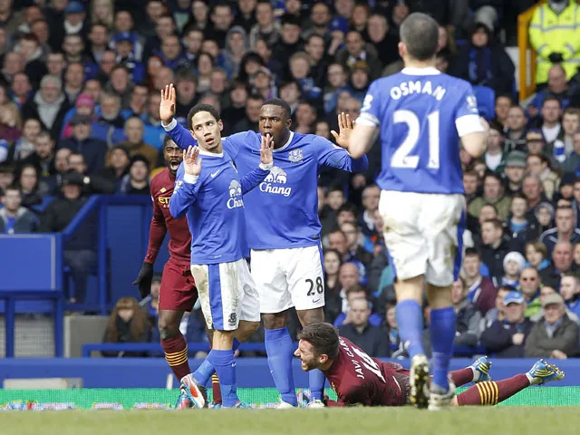 Everton thought that they had taken the lead after 12 minutes when Kevin Mirallas smashed the ball past Joe Hart, but the assistant referee judged the striker to be offside.
