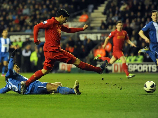 Luis Suarez scored a hat-trick as Liverpool ran out comfortable 4-0 winners over Wigan Athletic in the Premier League this evening.