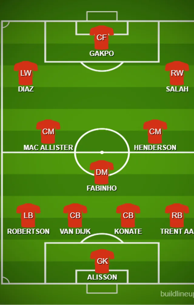 Mohamed Salah continues to hold the fort on the right, while Luis Diaz has waltzed back into the team at left-wing since recovering from knee surgery, leaving Cody Gakpo, Diogo Jota and Darwin Nunez to fight for the final attacking spot - a battle that the former may win for now.