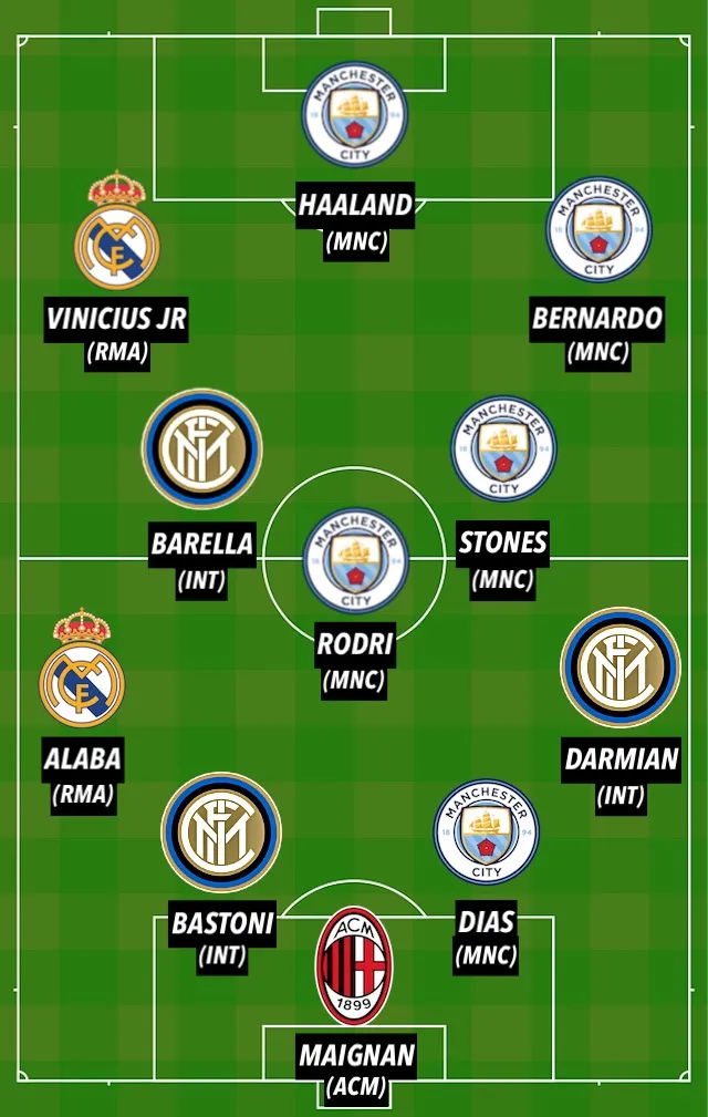 Sports Mole's Champions League team of the week (4-3-3): Maignan; Darmian, Dias, Bastoni, Alaba; Stones, Rodri, Barella; Bernardo, Haaland, Vinicius