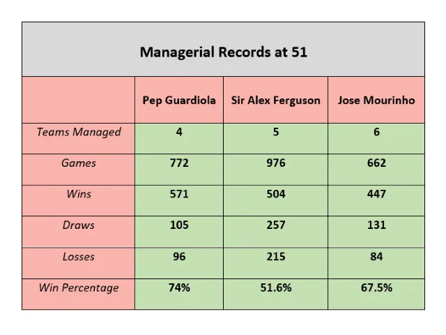 When comparing Guardiola with both Ferguson and Mourinho, it is clear that all three coaches have had a significant influence on the teams they have managed and were hugely successful as a result. While both Ferguson and Mourinho did not begin at the very top like Guardiola, the latter has still managed to claim 15 and 11 more trophies than the Scotsman and the Portuguese respectively before the age of 51. In addition, Guardiola's outstanding win percentage of 74% is far superior to Ferguson's 51.6% and Mourinho's 67.5%.