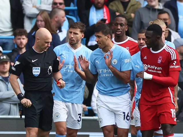 Rodri was dismissed just 27 seconds into the second half of City's 2-0 home win over Forest after raising his hands towards the neck of Morgan Gibbs-White during a heated confrontation by the corner flag.