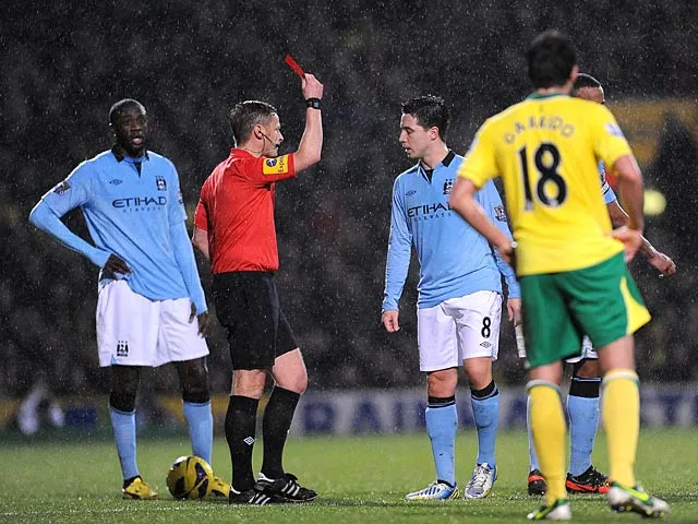 Nasri's dismissal gifted Norwich the ascendancy, but Sergio Aguero restored City's cushion with a well-taken third.