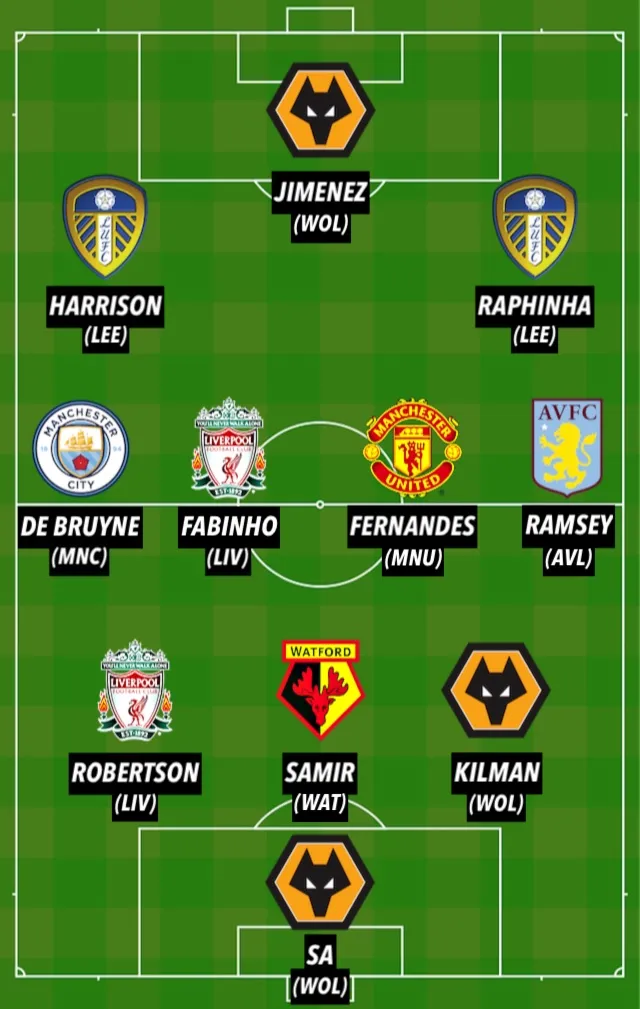 Sports Mole's Premier League team of the week (3-4-3): Sa; Kilman, Samir, Robertson; Ramsey, Fernandes, Fabinho, De Bruyne; Raphinha, Jimenez, Harrison