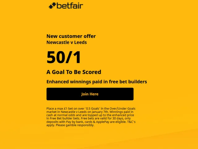 T&C: Place a max £1 bet on over '0.5 Goals' in the Over/Under Goals market in Newcastle v Leeds on January 7th. Winnings paid in cash at normal odds and are topped up to the enhanced price in Free Bet builder bets. Free bets are valid for 30 days, only deposits with Pay by bank, cards & ApplePay are eligible. T&C's apply. Please gamble responsibly.