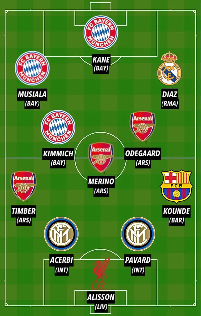 Sports Mole's Champions League Team of the Week (4-3-3): Alisson (Liverpool); Kounde (Barcelona), Pavard (Inter), Acerbi (Inter), Timber (Arsenal); Kimmich (Bayern), Merino (Arsenal), Odegaard (Arsenal); Diaz (Real Madrid), Kane (Bayern), Musiala (Bayern)