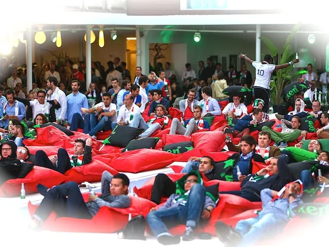 After devouring the best buffet of the weekend, rain begins to fall heavily on the open-air venue and the rows of beanbags where we're going to watch the game.