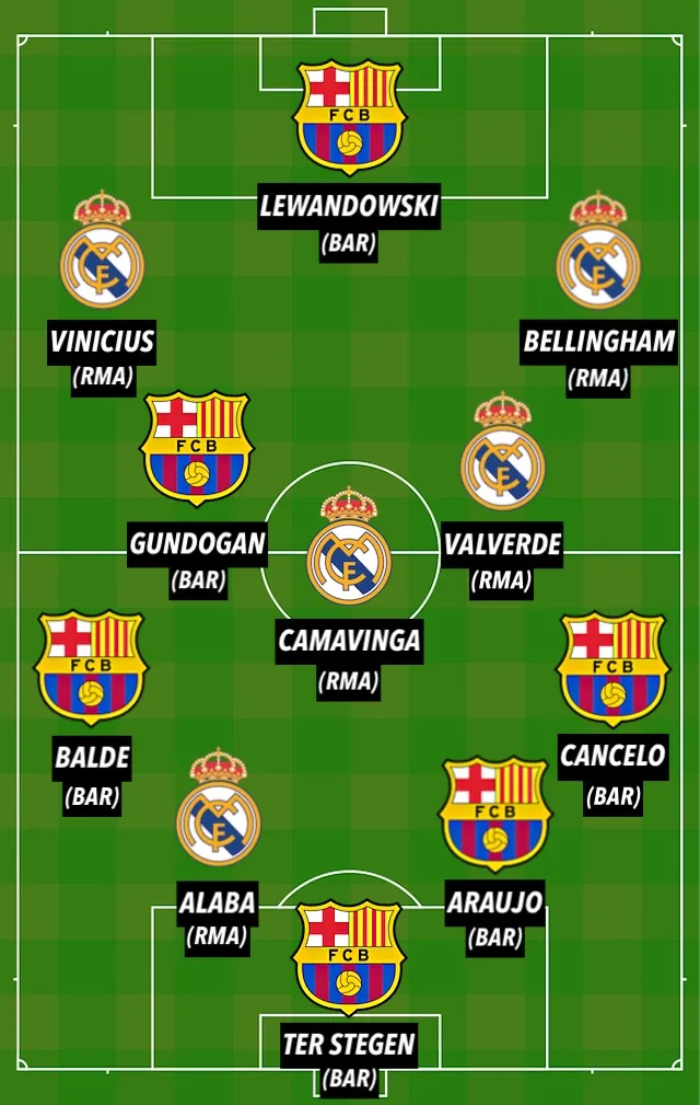 Rodrygo has flattered to deceive for Real Madrid this season, but Joselu is worth a mention due to his five goals this season. As for Barcelona, 16-year-old Lamine Yamal has become a vital player in 2023-24, while Joao Felix has impressed since arriving on loan from Atletico Madrid, but Vinicius and Lewandowski were always going to be the most advanced players in this side.