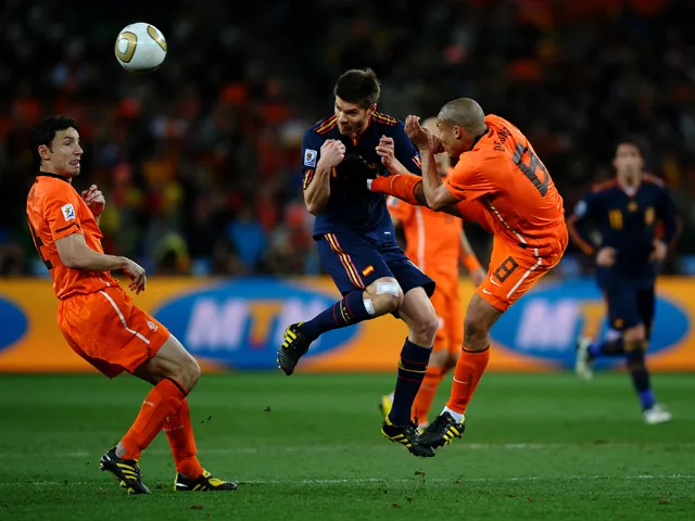 Holland's play did not let off even with the tired legs on the pitch, as finally after 109 minutes the game saw its first red card. Heitinga was shown his second yellow card for hauling back Andres Iniesta just outside the box, while at the other end Joris Mathijsen might have done better with a late header.