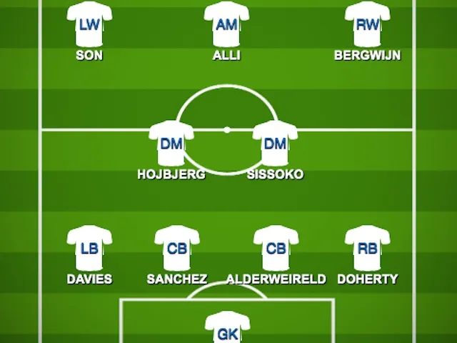 1. Hugo Lloris (GK) 2. Matt Doherty (DF) 4. Toby Alderweireld (DF) 5. Pierre-Emile Hojbjerg (MF) 6. Davinson Sanchez (DF) 7. Son Heung-min (MF) 8. Harry Winks (MF) 10. Harry Kane (FW) 11. Erik Lamela (MF) 12. Joe Hart (GK) 15. Eric Dier (MF) 17. Moussa Sissoko (MF) 18. Giovani Lo Celso (MF) 19. Ryan Sessegnon (MF) 20. Dele Alli (MF) 21. Juan Foyth (DF) 22. Paulo Gazzaniga (GK) 23. Steven Bergwijn (MF) 24. Serge Aurier (DF) 25. Japhet Tanganga (DF) 27. Lucas Moura (MF) 28. Tanguy Ndombele (MF) 30. Gedson Fernandes (MF) 33. Ben Davies (DF) 40. Brandon Austin (GK) 41. Alfie Whiteman (GK) 47. Jack Clarke (FW) 48. Harvey White (MF) 49. Dennis Cirkin (DF) - Danny Rose (DF) - Cameron Carter-Vickers (DF)
