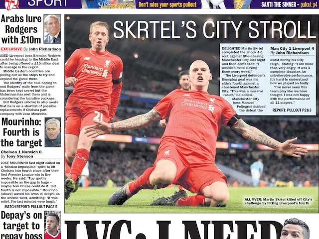'Skrtel's City Stroll': Martin Skrtel claims that he would enjoy playing City every week after he netted the Reds' fourth in Manchester, while the paper also reports on a big-money offer for former Anfield boss Brendan Rodgers to move to the Middle East.