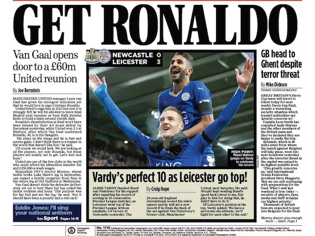 'Perfect 10': Vardy's heroics in the North East take top billing in The Mail On Sunday, alongside reports of Louis van Gaal's ongoing pursuit of Cristiano Ronaldo.