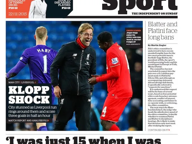 'Klopp Shock': An ecstatic Klopp lights up The Independent, who also report on the latest developments at FIFA for Sepp Blatter and Michel Platini.