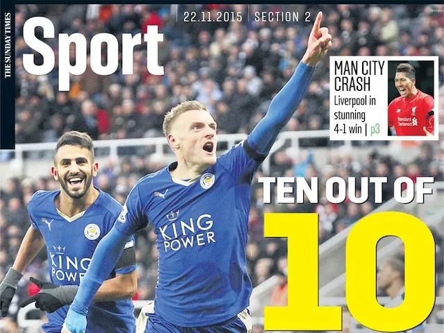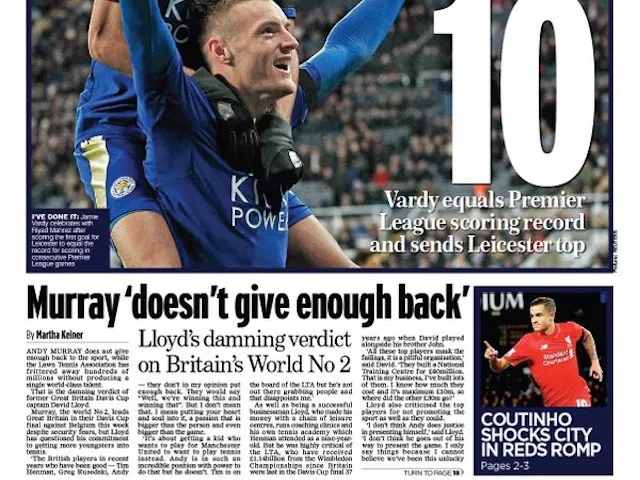 'Ten Out of 10': The sport section leads with Jamie Vardy equalling Ruud van Nistelrooy's record of scoring in ten consecutive Premier League games.