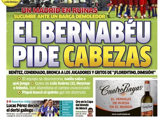 'Ruined Madrid Succumb To Devastating Barca': No surprises as the Madrid-based daily leads with Barcelona's 4-0 humiliation of their capital rivals at the Bernabeu.
