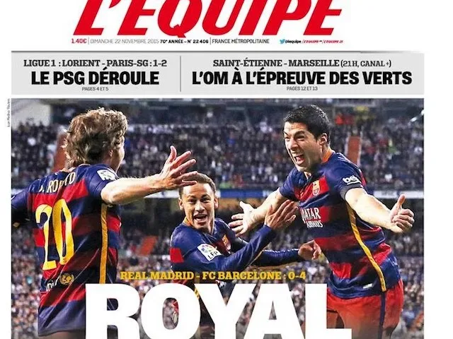 'Royal Barcelona': The French newspaper leads with El Clasico, reflecting on a "beautiful demonstration" from Barca against Madrid offset against a tribute to the victims of the attacks in Paris.