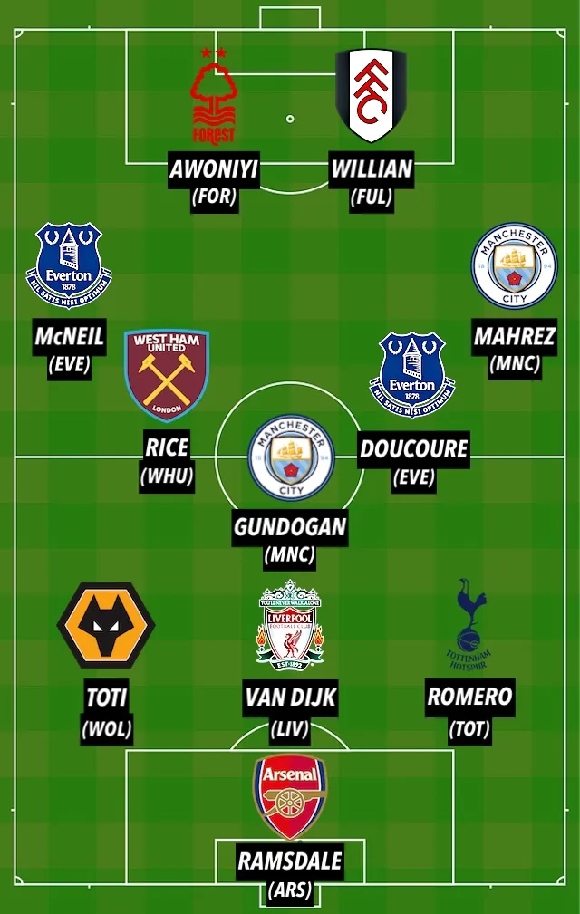 Sports Mole's Premier League Team of the Week (3-5-2): Ramsdale; Romero, Van Dijk, Toti; Mahrez, Doucoure, Gundogan, Rice, McNeil; Willian, Awoniyi