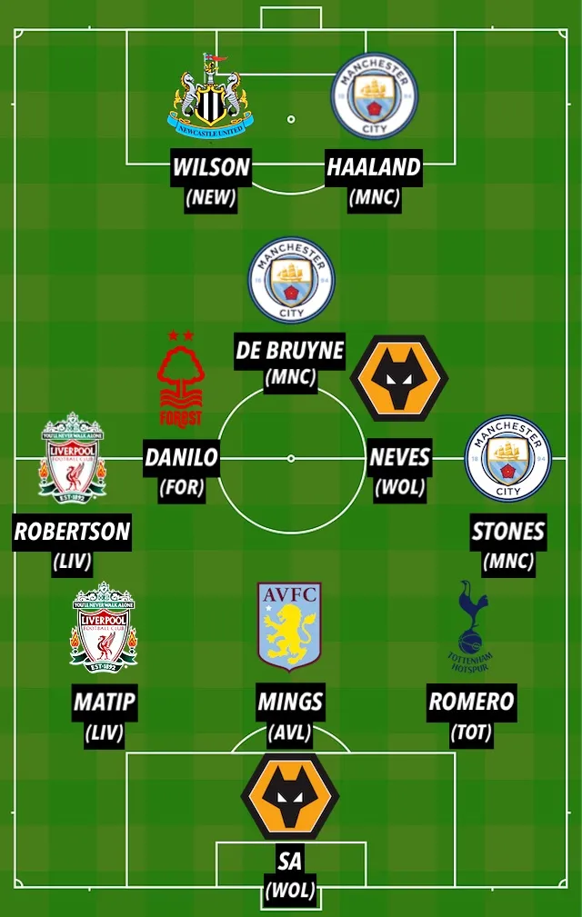 Sports Mole's Premier League Team of the Week (3-5-2): Sa; Romero, Mings, Matip; Stones, Neves, De Bruyne, Danilo, Robertson; Haaland, Wilson