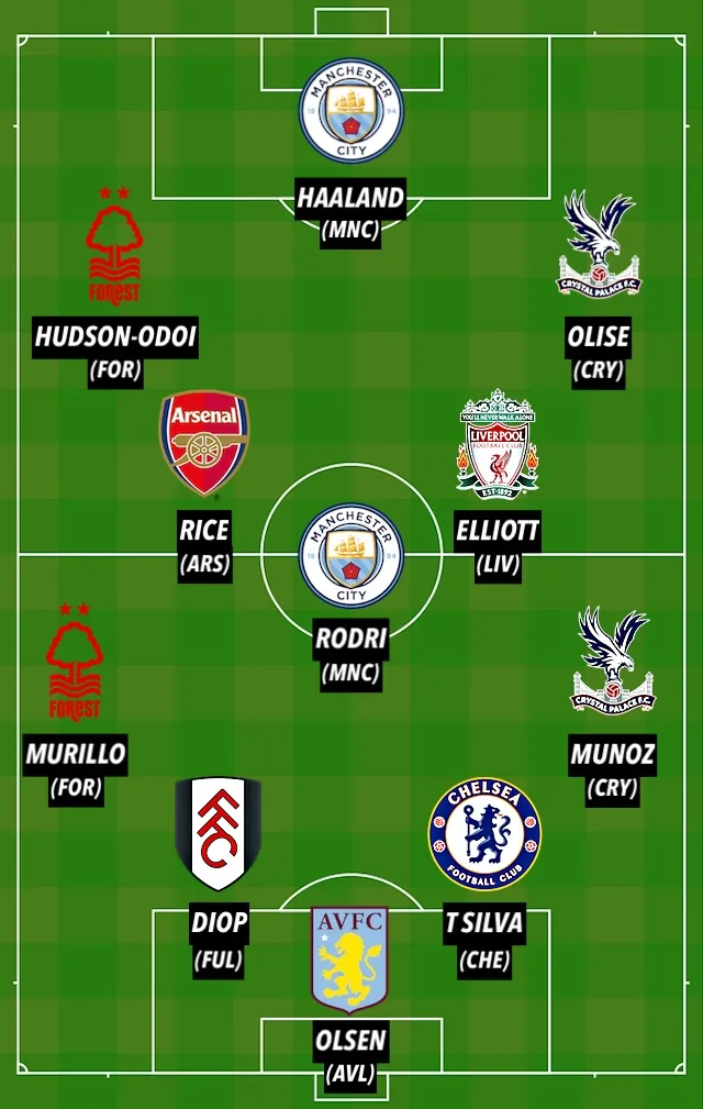 Sports Mole's Premier League Team of the Week (4-3-3): Olsen; Munoz, T. Silva, Diop, Murillo; Elliott, Rodri, Rice; Olise, Haaland, Hudson-Odoi