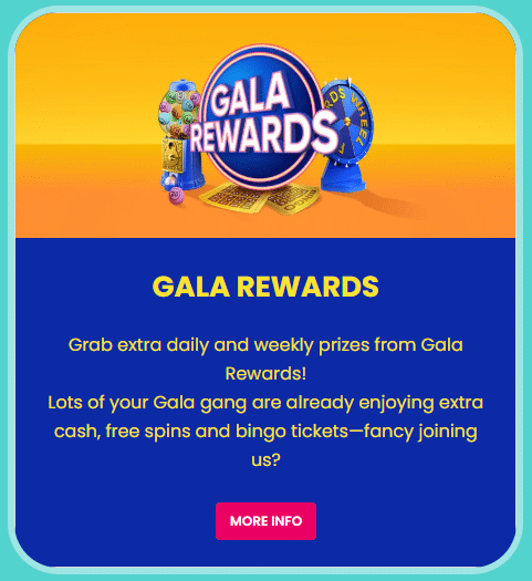 Opt-in the Gala Rewards programme to earn ongoing casino and bingo offers when you play games at Gala Bingo. The rewards range from free spins and free bingo tickets to cashback, cash prizes and tournament entries.