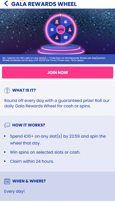Earn spins for the Casino Rewards Wheel when you play casino games. As for rewards, you can get free spins or up to £100 in cash for any day you spend at least £10 on slots.
