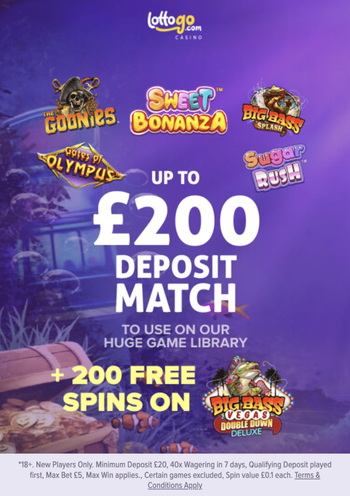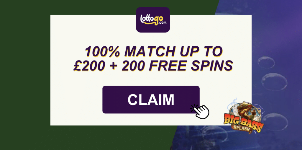 The LottoGo welcome bonus is a 100% deposit match up to £200 plus 200 free spins on Big Bass Splash for new UK players.