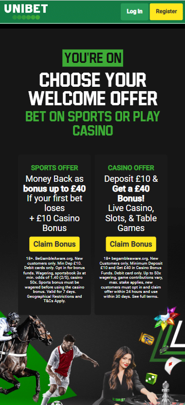 No, you cannot. You can only claim one welcome offer from Unibet’s range of promotions. Choose carefully between the sportsbook, casino, horse racing, or poker offers based on your preferred gaming style, as attempting to claim multiple bonuses will result in the forfeiture of all welcome bonuses. One customer, one bonus – simple rules.