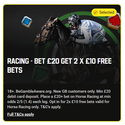 Unibet also provides a dedicated horse racing welcome offer. New customers can receive two £10 free bets for future racing wagers. The mechanics of this offer are straightforward. Simply place a qualifying bet of £20 on horse racing at minimum odds of 2/5 (1.4). Upon settlement, you’ll receive two separate £10 free bets to use on horse racing markets.