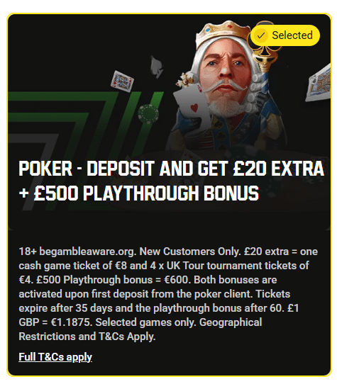 | Poker | Deposit £20, get £20 tournament tickets + £500 playthrough bonus | Claim offer |