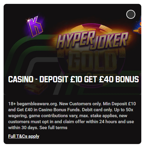 | Casino | Deposit £10, get a £40 casino bonus | Claim offer |