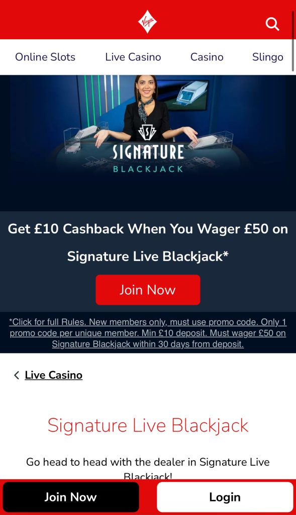 There is, however, one exception: If you want to opt in for the Live Casino offer, you must enter the promo code SIGNATURE during registration to claim the £10 cashback on Live Blackjack. This code unlocks a separate blackjack welcome bonus, which is separate from the main Virgin Games offer.