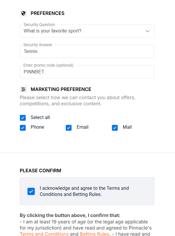 6. Finally, set up your security question and enter the Pinnacle promo code PINNBET in the optional section.