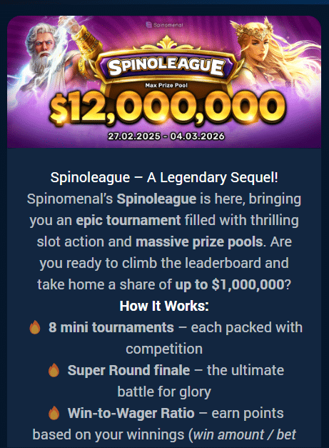 The most ambitious promotion on Pinnacle is Spinomenal’s Spinoleague with a massive $12,000,000 maximum prize pool. This epic tournament series features: